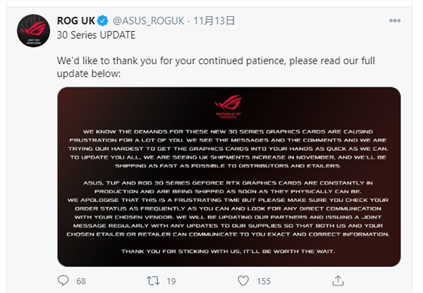 从9月17日首发RTX 3080显卡算起,NVIDIA的RTX 30系列显卡上市马上就2个月了,然而缺货问题一直是个烦心事,现在都没解决。 从电商平台的情况来看,RTX 3090显卡的供应情况好了不少,除了个别型号之外多数还有货,而且大部分价格都超过了官方的11999元建议价,普遍在12999元以上,只有一两款型号是11999元及以内的。 当然,RTX 3090显卡这价格显然不是一般人能买的,主力还是RTX 3080及RTX 3070显卡,然而这两个也是缺货最严重的,不仅缺货,价格也要比建议价高出几百块,有些黄牛加价更狠。 针对RTX 30系列显卡的缺货情况,华硕英国公司在推上发布了公告,表示11月份正在逐渐增加显卡产量,生产完之后也会争取马上发货,华硕承诺尽快交付给大家。 对于玩家,华硕建议大家多检查一下订单发货情况,并积极与供应商直接联系。 |