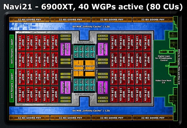 RX 6800正式解禁上市的时候,我们曾经解析过其幕后的RDNA 2架构的设计与特性。现在,国外大神又根据RNDA 2的内核图,绘制了各个模块的分布。 RDNA 2架构的研发由AMD Radeon技术事业部工程研发高级副总裁David Wang(王启尚)主导,大名鼎鼎的GCN架构就是他的杰作。 王启尚早年供职于ATI,后随着收购加入AMD,前些年曾一度离开AMD前往Synaptics新思科技。 2018年,王启尚在苏姿丰的邀请下回归AMD,再次出手不凡,RDNA 2架构一举让AMD显卡回到了与NVIDIA在高端旗鼓相当的地位。 正是在王启尚的领导下,RDNA 2架构历时16个月研发完成,顺利实现了当初的设计目标:性能提升1倍、能效提升至少50%、完整支持DX12U和光线追踪等技术特性。 AMD曾明确表示,RNA 2架构的设计借鉴了Zen CPU架构的先进思想,还有报道称Zen开发团队直接介入了RDNA 2的设计,而在RDNA 2架构的布局上,也明显能看到Zen的影子,确切地说是Zen 2/3。 RDNA 2架构共有80组计算单元,分为两组,旁边则是两组各64MB容量的Infinity Cache无限缓存,其作用有些类似三级缓存,是不是像极了Zen 2/3上的两组CCX模块加两组三级缓存的设计? RDNA 2架构的大核心Big Navi(Nvai 21)采用台积电7nm工艺制造,集成晶体管268亿个,核心面积519平方毫米,相比之下上代7nm Navi 10集成103亿个晶体管、核心面积251平方毫米。 也就是说,Navi 21核心在晶体管增加1.61倍的情况下,面积只增加了1.07倍,就实现了计算规模翻番、性能提升1倍以上、能效提升50%。 以下是RDNA 2不同模块的简介: 红色:WGP,也就是Work Group Processor(工作组处理器),由两个计算单元(CU)组成,共计40组,包含5120个ALU单元,也就是常说的流处理器。 蓝色:Infinity Cach无限缓存,共有两组,每组容量64MB,总容量128MB。 灰色:Infinity Fabric互连总线、无限缓存控制器。 青色:二级缓存,每组256KB,共有16组,总容量4MB。 橘色:指令前端、几何处理器(存疑)。 黄色:ROP光栅单元,每组8个,共有128个。 粉色:光栅着色器、原语单元。 橙色:GDDR6显存控制器物理层,每组32-bit,总位宽256-bit。 绿色:XGMI/Infinity连接控制器、PCIe控制器、显示控制器、编解码控制器等。 |