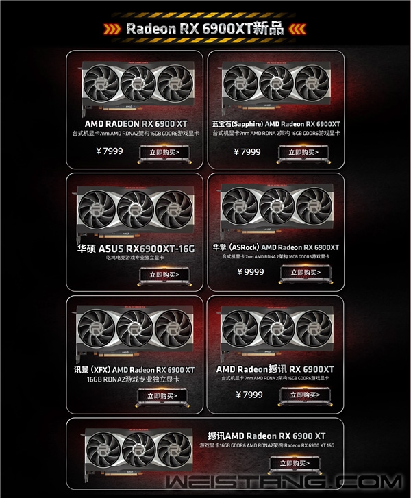 12月8日晚21点整,AMD新一代卡皇RX 6900 XT在京东平台开启独家预约。22点整,京东、天猫平台同步正式发售。 首发上市的都是纯公版,包括AMD、蓝宝石、撼迅、讯景、华硕、华擎等品牌,价格方面AMD、蓝宝石、撼迅都已公布坚持建议零售价7999元,意外的是华擎居然要9999元,平白多了2000块钱,不知从何而来。 首发期间,京东没有提供任何优惠,天猫方面按规则晒单返价值100元天猫超市卡,购买RX 6900 XT显卡、锐龙处理器、主板套装,按规则晒单返价值200元天猫超市卡。 RX 6900 XT作为新卡皇,基于7nm工艺、RDNA 3架构,支持SAM显存智取、Infinity Cache无限缓存、DXR光线追踪、Radeon Anti-Lag抗延迟、Radeon Boost性能加速、FreeSync同步显示等技术。 它拥有80组计算单元、5120个流处理器,相比于RX 6800 XT多了8组、512个,除此之外几乎一模一样:核心频率2015-2250MHz、128MB无限缓存、256-bit 16GB GDDR6显存、热设计功耗300W。 |