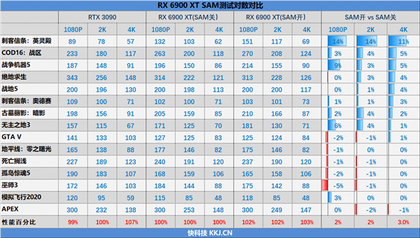 AMD锐龙5000系列处理器、400/500系列主板、RX 6000系列显卡组成的3A平台带来了全新的SAM显存智取技术,可以让处理器访问显卡的全部容量显存,从而提升游戏性能,官方宣称幅度可以超过10%。 SAM技术其实是基于PCIe标准规范,因此理论上NVIDIA显卡、Intel处理器/主板同样支持。NVIDIA就曾公开表态过在研究,Intel平台更是在技术上从6年前的四代酷睿、8系列主板都没问题。 近日,华硕、微星、华擎等厂商陆续开始为Intel 400系列主板发放新BIOS,搭配十代酷睿处理器,即可开启SAM加速。 那么实际效果如何? 所用处理器为i9-10900K,主板为华硕ROG MAXIMUS XII EXTREME(M12E) Z490,升级到最新BIOS,打开“大于4G地址空间解码”(Above 4G Decode)、“Re-Size BAR”两个选项即可。 话不多说,直接放结果: 所测15款游戏,SAM开启后平均提升了2-3%,4K下更明显一些。这时候,RX 6900 XT对比RTX 3090 1080p/2K下可以领先2-3%,4K下的差距从7%缩小到不足4%。 其中9款游戏得到了不同程度的提升,占总数的六成,尤其是《刺客信条:英灵殿》达到了惊人的11-14%,《战争机器5》最多也有9%,《无主之地3》则是最多6%,但有趣的是最大幅度都是在1080p下取得的。 另外6款游戏略有下降,但普遍都在1-2%,几乎毫无影响,唯一例外的就是《巫师3》在1080p下损失了5%,拉低了该分辨率下的平均值。 而在4K下只有《APEX英雄》损失了1%,其他9款提升了1-11%、5款无变化。 总之,Intel平台开启SAM之后还是挺有效果的,但也要看游戏和分辨率,当然现在只是初步支持,相信后续随着BIOS优化到位,效果还会更明显。 |