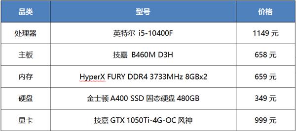 千余元的十代酷睿处理器,i5-10400F拥有6核12线程,睿频最高可达4.3GHz,是当前性价比极高的一款中端处理器。主板选配技嘉的B460芯片组主板,虽然是M-ATX小板设计,但是依然拥有4条内存插槽,支持M.2接口,最重要的是未来还可以升级i7或者i9处理器。显卡性能和价格成正比,虽然GTX1050Ti的性能与高端产品没有可比性,但是适当降低一些画质依然可以流畅运行目前所有主流游戏。 主板拥有4条内存插槽,但是当前选择2条高频内存组双通道更划算,因为现在如果选低频内存,未来升级高频内存也会降低到低频内存使用,十分不划算,所以现在购买高频内存不仅有助于现阶段性能提升,对未来也更有保障。HyperX FURY DDR4雷电系列骇客神条最高频率可选3733MHz,现在购买2条8GB内存组成16GB已经可以满足需求,未来再升级同款内存组成32GB即可。固态硬盘选金士顿A400 SSD固态硬盘480GB,经济实惠的第一选择,读写速度达到了500MB/s和450MB/s,而售价只有300多元,用于系统盘以及游戏安装盘可以大大提升加载速度,并且480GB的容量,日常应用已经绰绰有余。