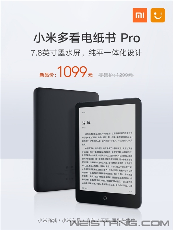 今天上午10点(12月15日),小米多看电纸书Pro正式开启预售。 预售享受100抵300的订金膨胀活动,零售价1299元的电纸书只需1099元到手,还有多看VIP 1年使用权赠送。按照安排,电纸书预计12月22日后陆续发货。 相较于第一代电纸书,Pro版从内到外可谓全方面升级。 外形方面,更大的7.8英寸墨水屏(尺寸与A5接近)、纯平一体化设计、7mm厚度、251g重量,正面还有一颗圆形Home键。 配置上,4核低功耗处理器、2GB RAM、32GB ROM,屏幕分辨率1872x1404(300PPI)、24级冷暖可调阅读灯、3200mAh电池、充满电标称待机时间长达70天,系统基于Android 8.1打造,支持双频Wi-Fi、蓝牙5.0等。 阅读配套方面,整合多看、当当、微信读书三大书库,支持语音搜书和五种书库导入方式(百度网盘、多看网盘、WLAN传书、USB传书、蓝牙传书等)且支持PDF重排,有青少年模式,支持格式包括epub、pdf、txt、excel、doc、ppt等。 交互方面,上线搜狗输入法,支持语音、拼音、笔画、五笔、英文等输入,适配墨水屏刷新速度。 |