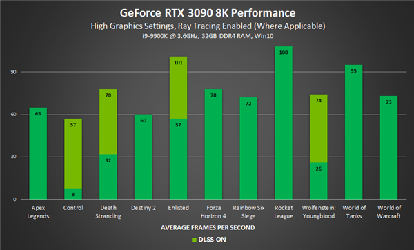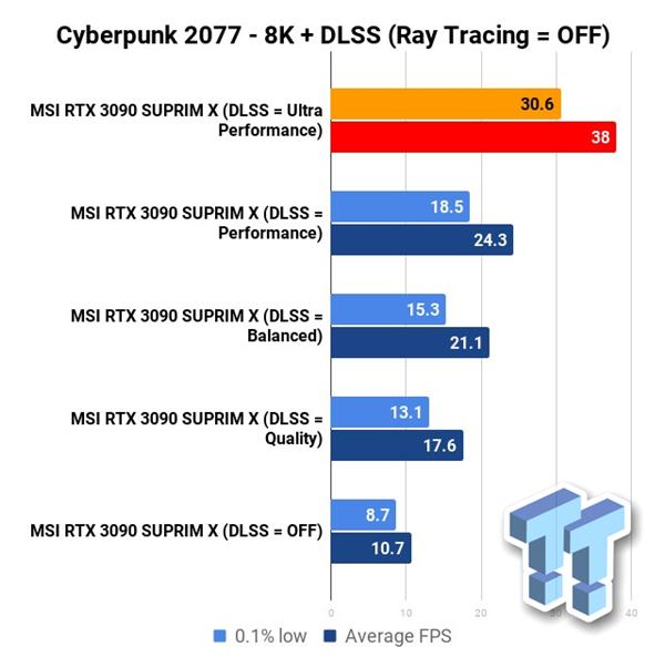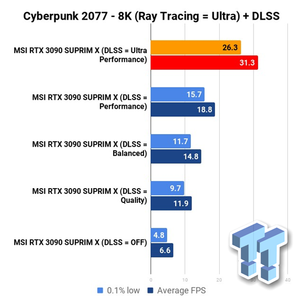 1万2千块的RTX 3090是目前消费级最顶级的显卡,按照NVIDIA发布时的说法,安培架构让8K游戏成为可能。 于是在发布三个月后,TT翻出RTX 3090,决定让它挑战当下最热门的3A新作《赛博朋克2077》,可结果出乎意料的失望。 测试平台选用了i9-10900K处理器、Z490主板等,画质方面全部推到最高,包括光追。 如图所示,光追设定最高的情况下, 如果不开DLSS“作弊”,平均帧数居然只有6.6FPS,99.9%的情况下帧数仅能维持在4.8FPS以上。 如果把DLSS设定为保障极限性能,游戏勉强能玩,平均31FPS。 关闭光追后,8K+DLSS极限性能,平均帧提高大到38FPS,99.9%的场景下帧数均稳定在30FPS以上,但关掉DLSS后,又降到个位数了。 另外,TT还发现,尽管RTX 3090配备了24GB GDDR6X显存,8K和光追压榨后仍旧不够用,关闭光追后,显存占用都降到21GB以下。 这证明,想要在8K分辨率下体验当前3A大作,DLSS可以说是必选项,而且最好是设定为保障最高性能。最后再贴一张NVIDIA的RTX 3090 8K游戏实测,这几款可玩性高一些。 |