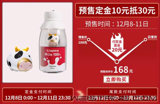 生肖牛限量版闪存盘不仅以造型萌趣的奶牛为原型,甚至连包装都采用了可爱的牛奶瓶设计,实为送礼佳品。金属闪存盘藏于牛鼻中,拥有64GB大容量,USB 3.2 Gen 1速度,读取速度高达100MB/s。 爆品采买正当时 指定产品白条3期免息 既然是年终最后一波福利大放送,诸多爆品采买正当时。包括内存、固态硬盘、闪存盘、存储卡等,是时候为自己的装备全面升级了。
