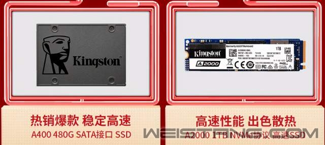 固态硬盘有两款爆款产品一定不能错过。还在使用机械硬盘并且主板没有M.2接口的用户推荐升级A400固态硬盘,读取速度可以达到500MB/s瞬间提升老电脑的效能。新装机用户,不能错过的就是A2000系列M.2固态硬盘,1TB超大容量,配合2200MB/s和2000MB/s的读写速度,让用户以实惠价格获得NVMe的高速性能。