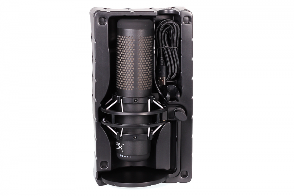 并且,从包装可知,HyperX声浪加强版RGB专业麦克风不仅兼容电脑、PS4、MAC,还支持平板电脑、智能手机等多种数码设备,对于主播来说可以更加自由的选择自己的直播平台。 惊艳亮相 质感十足的麦克风 打开包装,HyperX声浪加强版RGB专业麦克风的真身映入眼帘,通体黑色的金属质感搭配金属支架,看起来分量十足,实际上也确实如此,这款麦克风的总重达到了710g,放置在桌面上十分稳固,不会轻易倾倒。