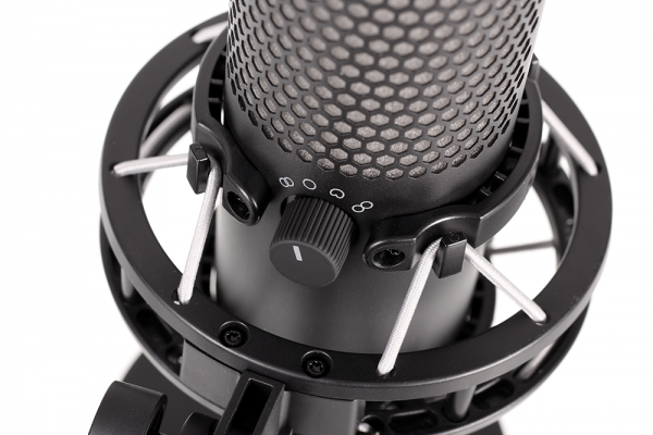 在极性模式快捷调整钮下还附带了3.5mm实时监听耳机插孔,可实时把控录音过程,实时监听录音效果,对于才艺直播来说这个功能十分方便。而耳机插孔下面的Type-C接口是用于供电及数据传输使用的。 在麦克风的底部是增益调节旋钮,轻轻旋转即可实现录音灵敏度的调整,方便主播灵活掌控。如果环境声过高时,可以调小增益,反之亦然,当主体声音偏弱的时候可以通过调大增益进行平衡,以达到最佳效果。
