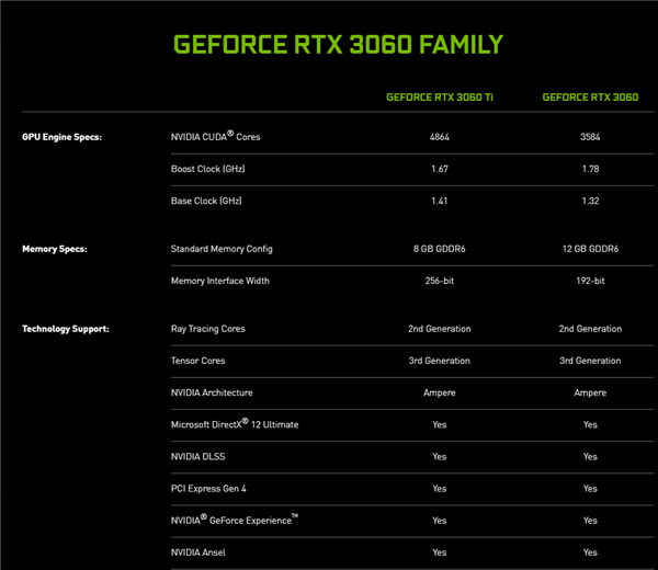 1月13日的CES展会上,NVIDIA正式发布了RTX 3060显卡,这是安培游戏显卡的第六位成员,10倍于GTX 1060显卡的光追性能,12GB显存比RTX 3080的10GB还要多,售价329美元起。 RTX 3060显卡没有如传闻那样命名为RTX 3060 Ultra,还是传统命名方式,这个系列是NVIDIA的甜点级显卡,上上代的GTX 1060显卡是NVIDIA史上销量最好的显卡之一。 规格方面,RTX 3060有3584个CUDA核心,基础频率1.32GHz,加速1.78GHz,搭配192bit位宽,12GB GDDR6显存,其浮点性能13TFLOPS,张量性能101TFLOPS,光追性能是25 RT-TFLOPS。 具体来说,其光栅性能是GTX 1060显卡的2倍,RTX光追性能是GTX 1060的10倍,不过比RTX 2060显卡高出大约20-25%左右。 RTX 3060显卡将于2月晚些时候开卖,售价329美元,之前的RTX 3060 Ti显卡是399美元。 |