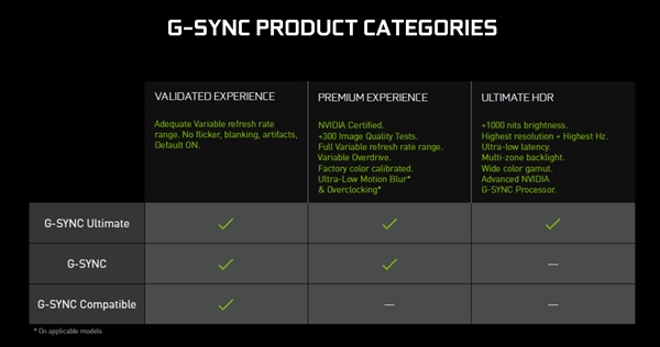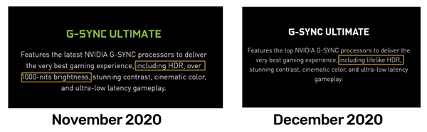 2013年,NVIDIA发布了革命性的同步技术G-Sync,可确保显示器画面刷新与GPU保持同步,从而避免撕裂、卡顿等现象,但需要显示器植入专用的G-Sync硬件模块。 两年后,AMD推出了自己的FreeSync同步方案,开放式设计,不需要专用硬件,效果也不差,很快就风靡开来,还被纳入了VESA适应性同步标准规范。 NVIDIA也逐步开放了G-Sync,划分为三个级别:一是G-Sync Compatible,不需要NVIDIA专用硬件;二是G-Sync,搭载专用硬件;三是G-Sync Ultimate,额外支持HDR,亮度不低于1000nits。 近日,NVIDIA宣布三款新的显示器纳入G-Sync Ultimate,分别是华硕PG32UQX、微星MEG MEG381CQR、LG 34GP950G,但是第一款峰值亮度高达1400nits,而后两款只有HDR 600认证,其实并不能满足G-Sync Ultimate的要求。 查看NVIDIA官方的最新要求,可以发现,G-Sync Ultimate中有关于亮度超过1000nits的要求,已经悄然被去掉了。 这就有点乱了:对于显示器来说,想拿到最高等级的G-Sync认证更简单了,但是对于消费者来说,即便是打着最高等级G-Sync认证的显示器,规格上也会有“漏洞”。 |