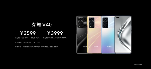 刚刚,荣耀总裁赵明公布了荣耀V40新机的价格。 8+128GB标准版3599元,8+256GB高配3999元,1月22日也就是今天上午12点正式开卖。 据悉,荣耀V40提供幻夜黑、钛空银、蔷薇金三种配色,背部创造性采用1:3:9:27的几何空间秩序重构,除了排布有美感还做到了AG磨砂和高光玻璃的无缝拼接。 基本配置上,荣耀V40拥有6.72英寸曲面OLED屏(10位面板)、分辨率2676x1236,左上角的挖孔内是1600万像素AI自拍镜头和色温传感器,120Hz高刷、自动色彩管理、DC调光等。 处理器为天玑1000+,摄像头组合是5000万像素RYYB(1/1.56 英寸大底、单像素1.0μm可四合一)、800万像素超广角、200万像素微距和激光对焦传感器,电池容量4000mAh,支持65瓦有线和55瓦无线快充等。 其它方面,荣耀V40还集成双线性马达、双立体声扬声器等,系统方面也对硬件做了全方面适配,并且在易用性、流畅性、私密性等方面做了大幅优化。 |