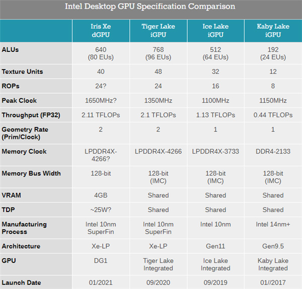 去年11月初,Intel正式发布了基于Xe LP架构的全新独立显卡,首款产品代号DG1,型号命名为Iris Xe MAX,面向入门级笔记本和台式机市场,还延伸到了媒体服务器领域。 当然,Tiger Lake、Rocket Lake 11代酷睿里集成的核芯显卡,也是基于同样的架构和类似的规格。 这也是1998年的i740昙花一现、2008年的Larrabee出师未捷之后,Intel首次以全新面貌出现在独立显卡市场上,NVIDIA、AMD终于迎来了新的对手。 发布之时,Intel表示Iris Xe独立显卡有移动版和桌面版,其中宏碁、华硕、戴尔等的笔记本已经搭载移动版,而桌面版会在2021年初上市,但仅限OEM市场。 Intel今天宣布,Iris Xe独立显卡的桌面版已经正式出货,首发包括华硕、七彩虹两款产品,仅用于OEM整机,不会零售。 其中,华硕的是被动静音设计,正面覆盖大面积的铝质散热片,背部接口一个DVI、一个HDMI、一个DisplayPort。 七彩虹的则用上了双风扇(有点夸张),接口看不清但应该相同。 Iris Xe独立显卡桌面版的核心规格,与移动版、核显版几乎毫无二致,都是10nm SuperFin工艺制造,最多96个执行单元(768个流处理器)、48个纹理单元、24个ROP单元,搭配128-bit位宽的4GB LPDDR4X独立显存,带宽为68GB/s,支持PCIe 4.0 x4。 当然了,频率、功耗都不尽相同,官方数据移动版1.35GHz、桌面版1.65GHz,而非官方数据说功耗分别为25W、30W。 不过诡异的是,Iris Xe移动版标称最多96个单元,也就是有低配版本,而桌面版首发时官方明确只有96个单元,结果首批发货的,都是80个单元的“阉割版”,也就是屏蔽了1/6的核心单元。 原因尚不清楚,但是考虑到即便满血版的Iris Xe独立显卡性能也只是入门级的,再割一刀更加难以想象。 Intel还强调了该卡的一些功能特性,包括三屏输出、硬件加速视频编解码(包括AV1解码)、Adaptive Sync适应性同步、DisplayHDR、DP4a深度学习推理加速,等等。 |