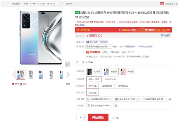 2月2日消息,荣耀V40将于今天上午10:08正式发售,起售价3599元,提供幻夜黑、钛空银、蔷薇金三种配色。 新机采用一块6.72英寸曲面屏,屏占比达到93.24%,屏幕两边的曲率为80度。荣耀V40这块屏幕不仅有10bit 10亿色原彩显示,还支持DCI-P3色域、HDR10和120Hz高刷新率,全局峰值亮度达到800尼特。 官方表示,荣耀V40每一片屏幕都经过产线色温校准之后出厂,力求为用户提供最优屏幕。 另外新机内置专业色温传感器和环境光传感器,可以实时感受外界光线,自动色温校准,智能调光。 核心配置上,荣耀V40搭载联发科天玑1000+旗舰处理器,提供128GB、256GB两种选择,电池容量为4000mAh,支持66W有线快充、50W无线快充。 影像方面,荣耀V40搭载5000万像素RYYB传感器,尺寸达到1/1.56,进光量更大。另外两颗镜头分别为800万像素超广角镜头和200万像素微距镜头,同时支持激光对焦。 此外,这次荣耀V40内置两颗线性马达,针对开心消消乐、新神魔大陆、王者荣耀、笑傲江湖等游戏进行震动适配。横向使用键盘时两颗马达可以共同工作,给玩家带来舒适的震感体验。 |