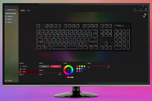 HyperX起源RGB游戏机械键盘采用了外露的LED指示灯,可以实现更明亮、更夺目的RGB灯效,甚至在白天光线充足的环境也可以拥有耀眼的光效。当然,其拥有5级亮度调节,如果是夜晚幽暗的环境可以适当减少亮度。在HyperX NGENUITY软件中,光效的色彩,光效的形式都可以自定义,并可以保存最多三组于键盘内置的芯片中,通过键盘的快捷键可以自由切换,即使外出携带也可随时调出自己的个性化配置。