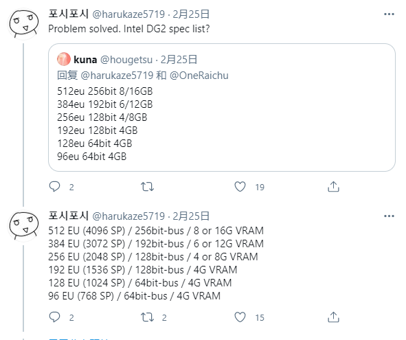 Intel Xe家族独立显卡正在一步步走来,此前已发布的Xe LP低功耗架构“DG1”只是针对入门级的桌面和笔记本,算是牛刀小试,接下来Xe HPG高性能架构的“DG2”,才是真正的大杀器,会同时应用于主流桌面和游戏本。 根据最新消息,Intel DG2显卡将有三个不同的核心,划分为六款不同的型号,核心、显存规格各异: Xe-HPG 512EU: DG2-512EU核心、512个执行单元、4096个核心(流处理器)、256-bit 8/16GB GDDR6显存 Xe-HPG 384EU: DG2-384EU核心、384个执行单元、3072个核心(流处理器)、192-bit 6/12GB GDDR6显存 Xe-HPG 256EU: DG2-384EU核心、256个执行单元、2048个核心(流处理器)、128-bit 4/8GB GDDR6显存 Xe-HPG 192EU: DG2-384EU核心、192个执行单元、1536个核心(流处理器)、128-bit 4GB GDDR6显存 Xe-HPG 128EU: DG2-128EU核心、128个执行单元、1024个核心(流处理器)、64-bit 4GB GDDR6显存 Xe-HPG 96EU: DG2-128EU核心、96个执行单元、768个核心(流处理器)、64-bit 4GB GDDR6显存 很显然,Intel DG2独立显卡面向的将是主流和低端游戏市场,而高端和发烧级市场将留给更高级的Xe HP架构。 虽然不同GPU架构的核心数量无法直接比较,但也有一定的对比参考。AMD、NVIDIA纷纷做到上万个核心的时候,Intel DG2最多才4096个,显然不是一个档次。 更何况,显存规格都是明摆着的,256-bit 16GB如今正是主流水准,64-bit甚至都已经在AMD、NVIDIA的独显里消失了,Intel依然还在做。 根据此前曝料,DG-384EU核心的面积只有大约190平方毫米,甚至比GTX 1060 GP106核心还要小一点,相比于RTX 3060 GA106核心小了足有三分之一。 |