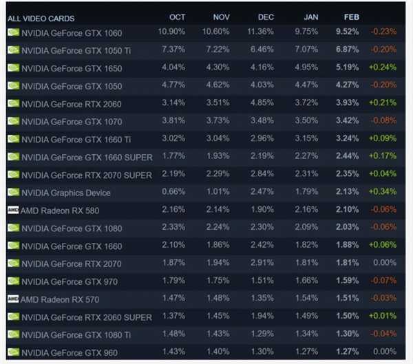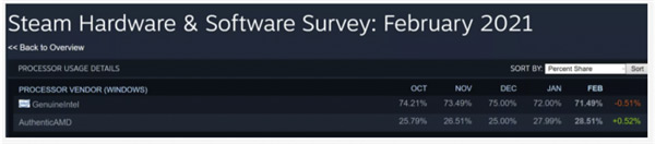 Steam发布了最新的软硬件月度调查报告,其中数据显示,AMD不断蚕食Intel处理器市场份额。 长期以来,AMD一直在蚕食英特尔在CPU市场上曾经的主导地位,这一趋势在第四季度发生了逆转,Intel市场份额首度增长,这主要是因为AMD的处理器短缺。 这种下滑在12月的Steam调查中得到了反映,当时AMD出现了多年来的首次下滑。此后恢复了正常,该公司处理器份额上个月上涨0.52%之后,现在占据了28.51%的份额。 显卡方面,RTX 3080涨幅最高,涨幅为0.11%至0.74%,其次是RTX 3060 Ti(涨幅0.08%至0.33%),然后是RTX 3090(涨幅0.07%至0.29%)。目前还没有看到RTX 3070的踪影,RTX 3060在2月底才推出。 Radeon RX 580依然是AMD份额最高的显卡,排在第十一位,榜单上依然没有Radeon RX 6000系列,这一点不奇怪。 另外,榜单中爬升幅度最大的两款产品分别是第三名的GTX 1650和第五名的RTX 2060。 其他方面,Windows 10 64位的占比提升到92%,不过Windows 7的占比有小幅提升;1920×1080仍是目前最常见的主分辨率,上涨0.59%至67.29%。 AMD对Intel逆袭,市场份额持续扩大,其中Zen3的表现功不可没,接下来他们还会有更强的产品,比如5nm工艺的Zen4,而反观Intel,11代Rocket Lake处理器仍然采用14nm制程。 接下来的5nm工艺的Zen4到来(Zen4最大的悬念就是架构及性能,考虑到Zen3在没升级工艺的情况下就实现了19%的IPC性能提升,Zen4升级5nm之后性能更可期。),不知道Intel怎么来应对? |