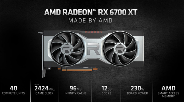 AMD终于发布了RX 6000系列家族的第四款产品“RX 6700 XT”,面向2K 1440p分辨率游戏。 不过,标准版的RX 6700并未同时发布,这在A卡历史上还是第一次。 RX 6700 XT仍然采用RDNA 2架构,不过核心从最大的Navi 21换成了中等规模的Navi 22,原生40组计算单元(2560个流处理器)、40个光追单元,核心游戏频率最高达到2424MHz,加速频率更是史无前例的2581MHz,相比于RX 6900 XT/6800 XT高出足有331MHz。 显存搭配128-bit 12GB GDDR6,整卡功耗230W,公版为开放式双风扇散热器,不过长度和RX 6900/6800系列保持一致。 RX 6700 XT仍然集成有特色高速缓存(Infinity Cache),不过容量从128MB削减到96MB。 同时继续支持显存智取(Smart Access),可以让处理器访问全部显存容量,搭配自家的锐龙5000系列处理器、400/500系列主板,以及Intel 10/11代酷睿平台,可以带来最多16%的游戏性能提升。 |