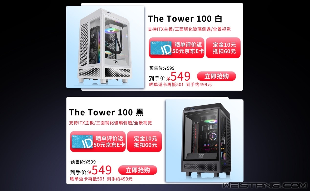 在今年一月份的TT台北线上电脑展上,TT发布了新款的艾坦Divider 300系列机箱以及Tower 900的迷你款——Tower100。 艾坦Divider300机箱采用与众不同的三角侧板设计,一半通透,一半隐秘,打造全新不一样的装机视觉盛宴。并且采用了创新型的钢板折皱设计,增加了镂空区域,更加有效的提升了机箱内部的散热效果。 想必大家都很熟悉曾经的Tower900机箱,Tower100机箱就是Tower900的迷你版,在继承了Tower900的强悍内部硬件扩充性的基础之上,Tower100还在机箱上方和后方有两颗120mm的风扇来确保机箱内的散热效果,机箱四周都有通风网,进一步的保障了机箱内部的温度,提高散热效果。 目前,这两款机箱均已上架Thermaltake京东自营旗舰店,并开启活动预售,黑、白两色艾坦Divider 300机箱预售价分别为499和529,3月16日——22日预售活动期间,支付10元定金可抵扣60元,评价晒单更有机会返50元京东E卡,到手价约为399和429!同样,Tower100机箱也参与此次活动,原价599的Tower100机箱,支付定金加评价晒单,相当于到手价只要499! 而有了机箱,怎能少了电源呢?爆款TR-2系列600W金牌电源也加入到活动优惠当中,10元定金可抵扣40元,评价晒单同样有机会获得50元京东E卡。不要犹豫,立刻行动起来吧。 |