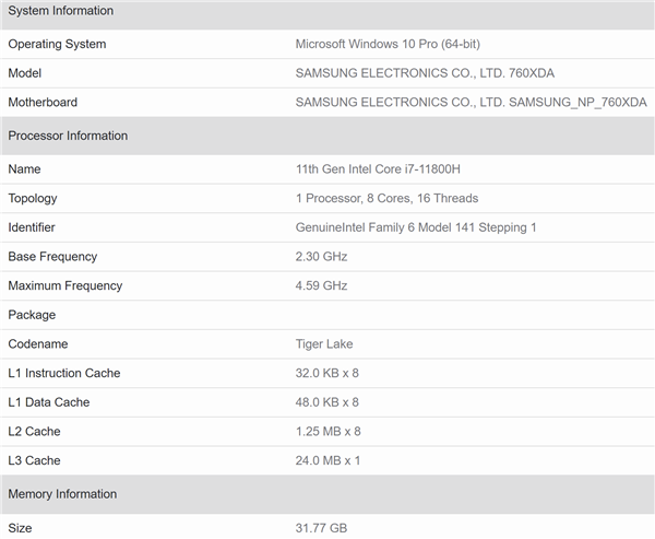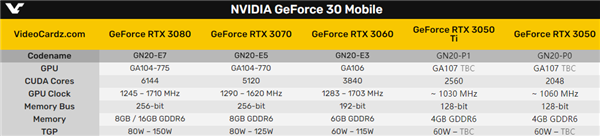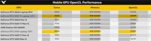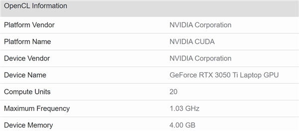 昨天晚上,我们在GeekBench 5数据库里看到了NVIDIA RTX 3050笔记本显卡,仅有2048个流处理器,搭配4GB GDDR6显存。 没想到仅仅过了一天,RTX 3050 Ti也现身了,确认拥有20个SM单元、2560个流处理器,显存也是4GB GDDR6。 频率依然未能正确识别,显示最高仅1.03GHz,肯定不对。 事实上,此前华硕、宏碁的笔记本配置里已经出现过RTX 3050 Ti,我们曾猜测它的流处理器可能会有2560个,结果还真猜中了。 但是,这也造成它和RTX 3060之间的空档有点大,后者的流处理器可是3840个。 至于性能,RTX 3050 Ti GeekBench 5 OpenCL计算跑分60479,略高于RTX 2060 Max-Q,同时比RTX 3050高了15%,后者和AMD RX 5600M很接近。 RTX 3050 Ti、RTX 3050应该都是基于尚未宣布的GA107小核心,桌面上也会有这两个型号,但不知道流处理器规模是否会保持一致,还是桌面上继续更多一些。 另外有趣的是处理器。RTX 3050搭配的是尚未发布的Intel Tiger Lake-H45家族的i5-11400H,6核心12线程,频率2.7-4.5GHz,二级缓存9MB,三级缓存12MB。 RTX 3050 Ti的搭档则高级一些,是同样属于H45家族的i7-11800H,8核心16线程,频率2.3-4.6GHz,二级缓存12MB,三级缓存24MB。 |