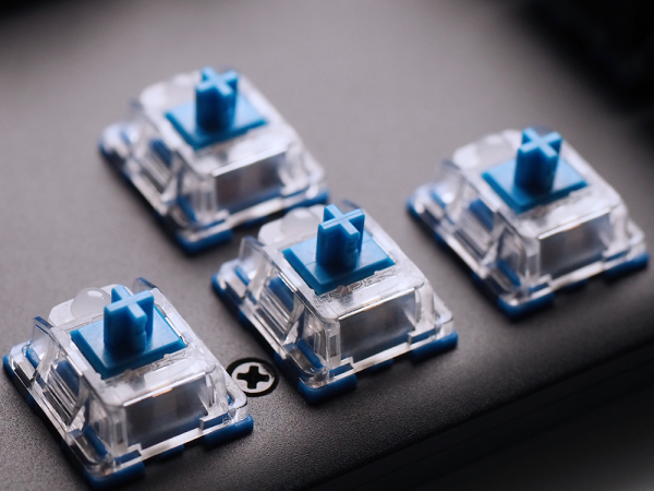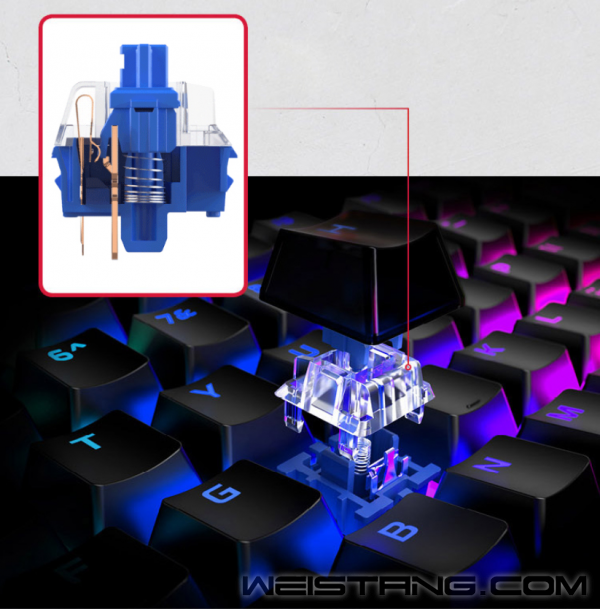 游戏中最怕的就是因为过激操作导致键盘位移,进而误操作贻误战机。对于其他键盘而言,300-500g的重量很常见,相对轻盈的重量稍微有些许过激操作,键盘就会在桌面上移动。想要改变现状有两种方法,一方面是加大自重,另一方面是加大键盘底部的摩擦力。显然起源RGB游戏机械键盘(冰轴版)用了第一种方法,其自重竟然达到了惊人的1075g,几乎等同于2-3个普通键盘的重量。自重加大了,可以有效缓解游戏中的过激操作,让键盘可以牢牢锁死桌面不轻易发生位移,让玩家的操作准确无误。 冰轴 一场触觉与听觉的盛宴 迷恋机械键盘的人不全因为手感,还有清脆的敲击声,尤其在网吧,噼里啪啦的敲击声就像是一场重金属演唱会,每个人都是主唱,演奏自己的旋律,宣泄自己的压力。与其他机械键轴不同,冰轴属于有声段落轴,特点就是复位位置更高,弹力更大,声音更清脆。其触发行程1.8mm,触发弹力50g,每一次操作会有轻微的段落感反馈,帮助玩家确认每一次操作是否准确触发。