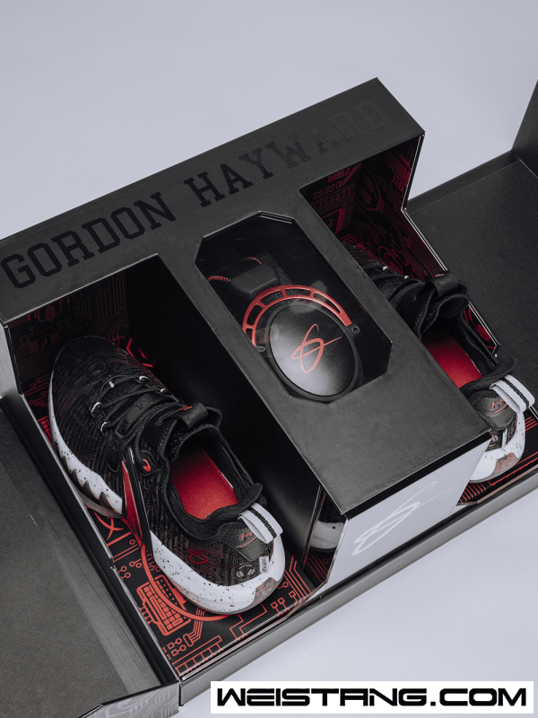 此次HyperX与安踏推出的海沃德限定礼盒中,包含了一支特供版的HyperX Cloud Alpha阿尔法游戏耳机,耳机两侧耳罩的图案为特别定制的海沃德logo。阿尔法游戏耳机采用突破性的双音腔驱动器,可减少失真,使音频更加清晰,让游戏中的声音定位更加精准;可拆卸的降噪麦克风,经 Discord 和TeamSpeak认证,确保玩家在游戏中沟通顺畅无误;耳罩内置舒适的记忆海绵,加宽头带外部包裹了柔韧的人造皮革,可为玩家带来更加出色的佩戴体验。 礼盒中还包含一双联名款的戈登•海沃德二代战靴——安踏GH 2。这款球鞋在配色上采用HyperX黑红主色,鞋面采用特殊胶印工艺,在不同角度下可呈现黑红渐变效果。鞋面设计灵感则来源于耳机电路板,并加入了耳机、键盘、鼠标和带有HyperX 标志的显示器等元素。后跟上的HyperX标志以及系带系统上的 “GAMER”等元素设计,更能体现双方联名的细节巧思。制鞋科技方面,联名款安踏GH 2球鞋的中底采用ALTI-FLASH缓震科技加持,提供充分的回弹缓震;TPU支撑由后跟移至中部,搭配前掌TPU,提供充分的侧向支撑及稳定性;全新的系带系统搭配内靴设计,更带来了极致的包裹性。