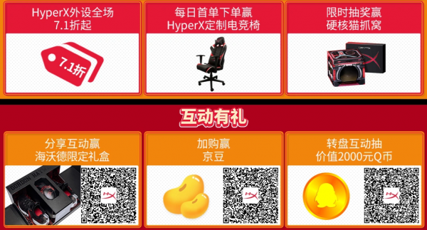 不仅如此,HyperX夺宝日中还有诸多福利活动等你来参与:3月17-19日期间,金士顿京东自营旗舰店中HyperX外设全场7.1折起;每日首单下单赢HyperX定制电竞椅;参与限时抽奖活动,还有机会获得硬核猫抓窝;分享互动,更有机会赢取海沃德限定礼盒;热门产品加购物车还可获赠京豆;参与转盘互动活动,就有机会抽取价值2000元的Q币!