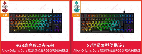 游戏键盘方面,HyperX Alloy Origins Core起源竞技版RGB游戏机械键盘全系列参加促销活动,日常价549元,促销期间优惠至469元,相当于85折优惠。起源竞技版RGB游戏机械键盘采用87键布局,配备航天级铝合金外壳,搭载HyperX自主键轴,拥有游戏模式和全键无冲突功能。通过HyperX NGENUITY驱动软件,还可自定义炫彩RGB动态光效、自定义宏命令等,并可将自定义设置存储到键盘板载芯片中,随时随地彰显个性风格。