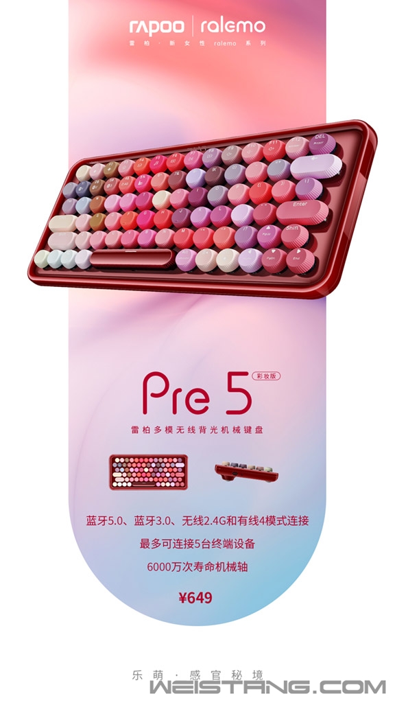 今天活泼过了头,连指尖都是「莓飞色舞」般的精彩。雷柏新女性系列ralemo Pre 5彩妆版机械键盘浸入蜜糖的79种色系,有薄涂的增添粉润起色,有厚涂色系透出元气少女感。 初春妆容,轻盈浪漫。兼容Windows和Mac OS双系统,打造颜值和功能都在线的“浆果热恋”装备,关于「舒适度」与「实用主张」,唤醒独属春季的元气娇俏。 丰富的眼影、颊彩、唇膏配色,暖光血橙、肉桂奶茶、紫梅火龙果、落樱甜情、珍珠奶橘、糖霜蜜桃、乌木玫瑰、半熟南瓜等79种不同颜色的键帽耀现灵动光采,衬出迷人气质,精准匹配各种肤色。大面积复古山楂红电镀底盘秒变目光收割机。立体金属让绝色光影流动。 动人的浪漫情致是ralemo系列给人留下的难以磨灭的迷人内核,ralemo Pre 5彩妆版键帽是圆形百褶形态,由内透出优雅可爱气质,87键人体工学布局,带来一种舒适与得体。这个春天你来站C位。键盘内置4000mAh可充电锂电池,USB-C接口快速充电,支持边充边用,4小时充满正常情况下可使用13天,适合各种场合使用。 掠过指间,和藏起来的雷柏自主办公机械轴悄悄细语,6000万次单轴使用寿命,1.2mm左右总行程轻柔触碰,用指腹感受敲击的清新、灵动和通透。 它是多设备办公和双系统的最佳拍档,蓝牙5.0、蓝牙3.0、无线2.4G、有线四种连接方式,可快速切换笔记本、电脑、手机、平板等5台设备,同时兼容Windows和Mac OS双系统,并针对系统匹配独有的按键布局,使得操作交互更加便利。 用更为舒适和更有颜值的装备,去迎接生活中的挑战。带着希望,涌动新的激情,勾勒轮廓而不受束缚。 雷柏ralemo Pre 5彩妆版机械键盘,,展现自由舒展的状态,演绎真我的姿态。“浆果热恋”盘,这抹灵动色彩,让你沦陷了吗? |