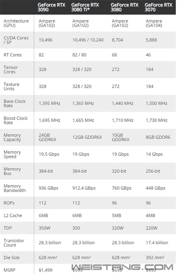 从去年12月拖到现在,RTX 3080 Ti仍旧是见首不见尾。 盛传4月中旬发布后,渠道最新消息称,NV内部通知再次修改,将RTX 3080 Ti延期到5月中旬。 规格方面,据称AIC们收到的公版PCB编号PG132 SKU 18,核心GA102-225。流处理器规模可能是和RTX 3090一样的82组SM(10496个CUDA),也可能削减2组SM到10240个CUDA,后者可能性较大,匹配384bit 12GB GDDR6X显存。 频率方面,RTX 3080 Ti的核心和加速频率都比RTX 3090下调了30MHz,影响不太大。 老黄之所以刀法精准,目的是希望将RTX 3080 Ti做到999美元的起售价,也就是和RTX 6900 XT一致,国行可能同样设定在7999元。当然,在部分游戏性能尤其是光追IP,RTX 3080 Ti将比RX 6900 XT体现出优势。 另外,对于NVIDIA来说还有一个很现实的问题,即挖矿性能要不要限制,RTX 3090的以太坊哈希值大约是106.5 MH/s。 |