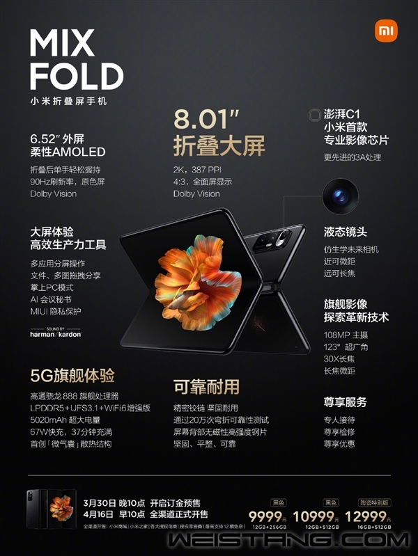 今日晚间,小米春季新品发布会上,小米首款折叠屏手机MIX FLOD正式发布,定价9999元起。 小米MIX FOLD采用内折折叠屏方案,展开后是一块8.01英寸的真全面屏,2480×1860分辨率,387PPI像素密度,4300000:1对比度,支持HDR10+ 10.7亿色,DCI-P3广色域,支持杜比视界(Dolby Vision)。 折叠状态下,则是6.52英寸的柔性AMOLED屏幕,分辨率2520×840,刷新率90Hz,亮度700nit,也支持杜比视界。 小米MIX FOLD通过了20万次弯折可靠性测试,极限折叠次数可达100万次,同时相比传统铰链减重27%,而且屏幕背部还铺满了无磁性的高强度钢片,让屏幕更平整、更坚韧。 核心规格上,搭载骁龙888旗舰处理器,LPDDR5+UFS3.1+Wi-Fi 6增强版,5020mAh超大电量,67W快充,37分钟充满。 首发小米首款专业影像芯片澎湃C1,采用仿生新技术的液态镜头,就像手机镜头里装入了 “人眼晶状体”,可流动的液体通过薄膜包裹,替代传统光学镜片,实现了焦距和焦点的变化。如此,一颗镜头同时实现长焦和微距两种功能。 拍照配备三摄,主摄是1.08亿像素超清镜头,1/1.52英寸大底,九合一像素融合2.1微米大像素,副摄是1300万像素123度超广角镜头,800万像素30倍长焦镜头,支持3倍光学变焦,等效于80mm长焦焦距。 价格方面,12GB+256GB 9999元、12GB+512GB 10999元、16GB+512GB 12999元,今晚10点开启订金预售,4月16日上午10点全渠道开卖。 |