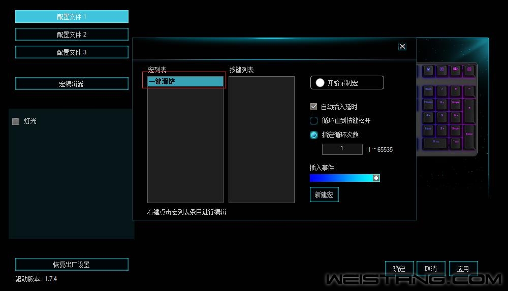 《赛博朋克2077》是知名《巫师》系列开发商CD PROJEKT RED公布的一款角色扮演游戏。而滑铲作为游戏中必不可少的技能,是一个非常实用的动作,能够游戏的规避伤害,意外的给敌人伤害,躲避子弹,增强走位的灵活性。今天笔者就使用雷柏V700RGB合金版背光游戏机械键盘强大的宏定义玩出一键滑铲的灵活闪避。 宏怎么设置去完成滑铲的动作,需要将默认的W键(向前)+Shift键(奔跑)同时按下,在奔跑的动作时再按下C键(蹲下),这样就能触发滑铲的动作。宏定义可以让你有效的闪避子弹的伤害,增强走位的灵活性。下面就为大家讲解如何通过雷柏V700RGB合金版的宏定义一键玩转滑铲。 步骤一:打开驱动,选中雷柏V700RGB合金版的宏编辑,点击“宏编辑器”,再点击右下角的“新建宏”,命名为“一键滑铲”。 步骤二:将“一键滑铲”的一系列操作进行录制,点击界面开始录制宏,并依次输入W和Shift,再输入C,点击“停止录制”,即完成了一组宏命令设置。 步骤三:设置好一键奔走的一系列动作之后,回到主页面,以T键为例,在设置页面,点击宏,选择刚才设置好的“一键滑铲”命令,点击“确定”后,点击“应用”,即可使用。 步骤四:设置完成后,就可以开启你的奔走闪现之旅,只要经过合理的设置,雷柏V700RGB合金版让你在游戏中行云流水般的奔走可以躲避敌人的追袭,给予敌人致命的侵袭。 RAPOO雷柏,领军国产外设品牌,实力大厂上市企业发布的V700RGB合金版幻彩背光游戏机械键盘,1680万色的幻彩RGB背光系统,19种的灯光模式,并支持单键背光可独立设置。金属的铝合金上盖,全键无冲突,全键可编程等诸多亮点集一身的雷柏V700RGB合金版,强大的驱动软件也让键盘的可玩性获得更大的提高,售价仅为299元,相信它一定会成为你首选的游戏利器,给你畅快的游戏操作体验。 |