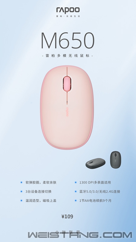 以往的好物,都是给你们种草的。但今天的不是这样,们更希望听到你们对于好物的不同打开方式,用创意的思维来解码生活。 夏天来了,又到了热烈甜蜜的季节。空气里满满甜甜的味道,各种各种清新感爆棚的夏日限定也纷纷涌现,雷柏为用户打造了一个欢快的“梦幻世界”,以“满分桃气”为主题,主角是雷柏M650多模无线布丁鼠标蜜桃味。柠檬布丁、蜜桃苏打、甜甜圈、冰淇淋等盛装出席。 在云端城漫步,雀跃心情仿佛彩虹一样绚烂。 作为资深“干饭人”,对于美食有着不可言述的热爱。M650以“布丁”的Q弹为灵感创作,饱满回弹,掌心里恰到好处的扁平化弧度,加上左右对称人体工学设计,提供给“打工人”的舒适手感。牛奶般丝滑上盖触感,橡胶滚轮顺畅滑动,温润细腻,可爱又梦幻,轻巧便携。 最具个性玩趣的是M650的硅胶圈,有效增强握持的舒适感,亲肤更耐磨,看似纯净而简单的构造,特性却非常突出,是古灵精怪的产品,M650采用可拆卸磁吸式上盖,为电池、接收器的收纳做好准备,萌趣十足。 拥有好看的皮囊,还充满有趣的灵魂。M650不仅能满足消费者对鼠标功能性的诉求,也要能和用户建立情感连接。鼠标包裹不同信号连接,蓝牙3.0、5.0和无线2.4G,3大无线信道,低功耗、低延迟、高效率,让适配范围更广。可在笔记本、电脑、手机、平板等3台终端设备的快速连接切换。1300 DPI高精度寻迹引擎,多种介质表面可使用。静音微动,有效减少点击噪音,适合需要安静办公的公共场所。9个月续航时常,活力满格。 蜜桃色晕染着初夏氛围感,自带光芒稳出场。M650“桃”到手边,Q弹软糯的舒适手感,甜得恰到好处,释出高甜元气。 |