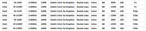Intel Rocket Lake 11代桌面酷睿发布之后,对应的面向工作站的至强W-1300系列也即将登场,规格同样不俗。 根据最新名单,至强W-1300系列共有七款型号,包括五款8核心(L3 16MB)、两款六核心(L3 12MB),分别对应RKL i9/i7、i5系列。 但它们不是桌面版的简单复刻,而是调整了具体参数,热设计功耗也在125W、35W之外增加了80W档位,但没有了65W。 核显也是集成Iris Xe,32个单元。 当然,相比桌面版,它们都会支持ECC内存等更高级的技术。 具体型号、规格如下: - 至强W-1390P:3.5-5.3GHz、125W——基本对应i9-11900K - 至强W-1390:2.8-5.2GHz、80W——基准频率比i9-11900高了300MHz - 至强W-1390T:1.5-4.9GHz、35W——对应i9-11900T - 至强W-1370:2.9-5.1GHz、80W - 至强W-1350P:4.0-5.1GHz、125W——对比i5-11600K分别高了100MHz、500MHz - 至强W-1350:3.3-5.0GHz、80W |