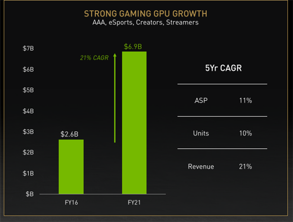昨天的GTC 2021大会上,NVIDIA发布了多款重磅产品,不论CPU还是GPU,还有网络加速器,三种芯片全面开花。 NVIDIA这几年来的发展速度引人瞩目,虽然营收跟Intel的700多亿还差很远,但是市值早就超过Intel了,而且在游戏卡、数据中心市场上优势愈发明显,新出的数据中心CPU——Grace就要抢至强的市场了。 在主业的GPU芯片上,NVIDIA这五年来的表现也让人惊讶,根据他们投资者会议上公布的信息,营收从2016财年的26亿美元增长到了69亿美元,规模是之前的2.5倍多。 营收大涨,一方面是出货量增加,销量每年的复合增长率是10%,另一方面则是显卡均价ASP,每年的复合增长率是11%。 5年复合增长率11%,算下来去年的显卡均价是5年前的1.7倍左右(而非1.5倍),换句话说NVIDIA的显卡平均售价比5年前高出70%左右。 2016财年是日历年2015年左右,那时候的显卡是GTX 900系列,GTX 980显卡不过3999元,GTX 980 Ti也不过是4699元,现在的旗舰卡售价都是万元左右了。 当然,只比较高端卡的话可能看不出更明显的差距,实际上显卡ASP均价被大量中低端卡拉下来了,以前1999元的显卡才是甜点卡,现在3999元的显卡称为甜点卡都勉强了。 |