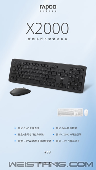 最近雷柏为办公族打造了新装置, 首款全静音无线键鼠套装, 雷柏X2000,静水流深。 在静置状态呈现全黑、全白的模样, 以舒适的结构烘托设计的力量。 2.4G无线连接技术,10米左右传输距离, 键鼠均采用静音按键设计,减小使用噪音的同时, 12个月续航时常,让生活办公环境,更添一份静谧幽雅。 键盘四角被切割成不规则的弧度,配合全尺寸键位布局, 让整体敲击手感与回弹力度更恰到好处, 输入轻盈顺滑,持久在线。 没有什么比舒适感更重要, 灵巧的鼠标,细节满分, 细腻磨砂表面,1000DPI高精度寻迹引擎, 点击别具一格的风格告白。 点开视频,喧嚣都市力,也能做个深呼吸。 视频链接:https://www.bilibili.com/video/BV1o84y1F7xz 视频链接:https://v.qq.com/x/page/d3242sq91jm.html X2000采用稳定可靠的2.4G无线连接技术,传输距离可以达到10米左右。同时,得益于雷柏的节能省电技术,X2000的键盘使用2节AAA电池,鼠标使用1节AA电池的情况下,便可以达到12个月左右的续航。 键盘采用全尺寸的键位布局,巧克力的独立键帽,确保手指可以充分与键帽接触,更轻盈顺滑,提升输入体验。作为输入设备的灵魂,手感必然是键盘最核心的要素,X2000的键盘采用层层筛选而出的高品质硅胶,提供恰到好处的敲击手感与回弹力度。而键鼠均采用静音设计,有效减小使用噪音,打造宁静的工作环境,适合多个场景使用。 键盘拥有14种多媒体的按键功能给予你舒适便捷的操控,通过FN+F功能键的组合以及2个Windows系统多媒体快捷键,让你能在第一时间打开诸如“浏览器主页”、“播放器”“邮件”这些功能的操作,贴心的多媒体按键,无论你在办公、娱乐等使用场景的时候都能事半功倍。 性能方面,X2000的鼠标采用高精度寻迹引擎,拥有1000DPI,光标定位灵敏,操控更显顺畅。经多项专业测试,鼠标可以在如布匹、纸张、皮革、树脂等多介质表面使用,进一步提升了鼠标的适应性,让你随时随地皆可开工。 |