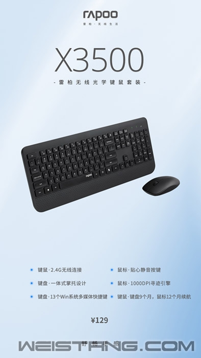 通过纯粹视角感受无线办公键鼠的舒适, 希望传递自信、坚强、有力的生活态度。 雷柏X3500无线键鼠套装, 以「黑」为主,在简约中叠放简单的生活层次。 2.4G无线连接,自由,这是她的自定义。 键盘9个月,鼠标12个月持久续航, 年轻的能量和充沛的生命力由此得到表达。 巧思细节照顾用户的使用感, 全尺寸键位布局,一体式掌托防滑耐磨, 巧克力独立键帽,恰到好处的敲击手感与回弹力度, 13种多媒体按键功能,彰显行动与活力。 鼠标增添轻盈呼吸感, 左右对称人体工程学, 从容的弧度曲线,1000DPI高精度寻迹引擎, 灵敏光标定位,多介质表面适用, 静音微动,减少点击噪音,静享片刻独处。 点开视频,展现自由舒展的状态,演绎真我的姿态。 视频链接:https://www.bilibili.com/video/BV1rh411U78v 视频链接:https://v.qq.com/x/page/u3239o5z6yr.html 稳定可靠的2.4G无线技术,传输稳定可靠,适配设备更为广泛。得益于雷柏低功耗技术及省电程序,只需在鼠标安装1节AA电池可以达到12个月续航,键盘安装1节AAA电池可以达到9个月续航,无论工作或娱乐,都能持久不断电,也免去频繁更换电池的麻烦。 X3500的键盘采用一体式掌托设计,为手掌部分提供更好的支撑力。掌托表面采用不规则的三角形纹理处理,防滑耐磨,提供更良好的输入体验。键盘采用巧克力独立键帽,精选硅胶颗粒,按键受力更加均匀、回弹更迅速,敲击轻盈如水。键帽字体采用镭雕技术,不易褪色,耐磨耐用。?自带13种多媒体功能快捷键,可快速切换互联网、多媒体、播放、音量调节等操作,工作娱乐两不误。 X3500搭配的鼠标采用左右对称的人体工程学设计,精致小巧,专为中小手型用户打造,操作更显自如。?鼠标上盖采用了细腻的磨砂喷漆,耐磨防滑,快速导汗水,质感细腻,手感舒适。性能方面,鼠标采用高精度寻迹引擎,DPI达到1000,光标定位灵敏,操控更显顺畅。经多项专业测试,鼠标可以在如木头、纸张、皮革、塑料等多介质表面使用,进一步提升了鼠标的适应性,让你随时随地皆可开工。鼠标采用静音微动按键,有效减小使用噪音,打造宁静的工作环境,特别适合图书馆、咖啡厅等环境使用。 |