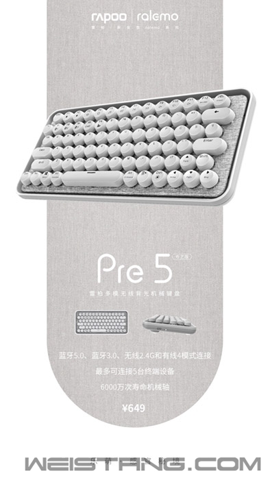 布,携天然之物的纯粹,呈现雷柏ralemo新女性系列夏季匠艺之选。至精归于至简,贴近日常,传递本真。 仙风道骨、文艺范、贵族材质,ralemo Pre 5布艺版机械键盘精选原料,灰布与白色键帽经纬交错,揉合出自然的双色效果,赋予ralemo Pre 5布艺版柔和、纯粹的诗意联想,特有的吸湿散热效果,正如夏夜月光下的舒适和清凉。 87键布局,简约线条,圆形百褶键帽,以趣味的形式塑造键帽,手感细腻,字符清晰耐磨,防汗防滑,码字气场全开。底盖圆滑弧度极具质感。白色背光系统,键盘支持6种背光模式,4档亮度调节,透过光线浮现真实的肌理,在布艺的质感中唤醒对天然的感知。 “轻描淡写的一天”,机械键盘支持雷柏自主办公机械轴,黑、青、茶、红,4种轴,6000万次单轴使用寿命,1.2mm左右的总行程,轻松敲击。拥有蓝牙5.0、蓝牙3.0、无线2.4G、有线四种连接方式,低功耗、低延迟、高效率,适配范围更广。可连接笔记本、电脑、手机、平板等5台设备,快速切换,简化繁琐的跨平台操作,满足一心多用,高能降伏生活工作的琐碎。内置4000mAh可充电锂电池,USB-C接口,快速充电,支持边充边用,4小时充满正常情况下可使用13天。 兼容Windows和Mac OS双系统,并针对系统匹配独有的按键布局,使得操作交互更加便利。在有线模式下,支持全键盘任意按键同时输入,每个按键命令均可以得到准确的反应和执行。多媒体快捷键,快速调用,对音乐播放、音量调节、互联网浏览等进行快捷操作,节省时间。 |