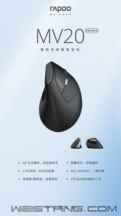平庸的怪物, 划过特立独行的轨迹, 职场人,“白热化”奔忙中,轻松点。 雷柏MV20无线垂直鼠标, 抹去繁复的装饰,从细节见真章, 精致打磨线条与弧度,缀以银色金属装饰, 兼具优雅与未来感。 侧翼内凹,构造垂直侧握形态,60°立式握持, 握持鼠标的姿势遵循手臂自然下垂,有效减少对手臂、手腕的压力, 预防鼠标手。 2.4G无线,约10米连接, 800-1600DPI,一键切换, 普通版/静音版,呼应风格的无限可能, 9个月续航时长,探索年轻世代舒适内核。 点开视频,向涌动的职场人发出公开邀请, 减轻压力,恢复健康之态 视频链接:https://www.bilibili.com/video/BV1ky4y1W7Va 视频链接:https://v.qq.com/x/page/f3246s48eow.html MV20采用约60°人体工学角度,立式侧卧的姿势,能使手臂更接近自然伸展的放松状态,告别长时间趴握带来的拘谨,自此告别鼠标手烦恼。 三角帆型造型,曲线圆润饱满,加上侧翼拇指槽,带来难以比拟的握持手感,让你更为自然掌控鼠标,工作、娱乐轻松尽兴。 无线2.4G连接方式,广泛适配市面上主流的PC,笔记本电脑,可提供约10米左右传输范围,信号稳定,传输高速,减少丢帧无响应现象。 高精度不可见光寻迹引擎,最高DPI达到1600,定位精准,快速操作时亦不易丢帧。经过多项专业严苛测试,可驰骋于树脂、纸张、皮革、木质、布匹等多介质表面,让你随时随地皆可开工。 鼠标背面设有DPI切换键,可在800/1200/1600三档DPI间快速切换,满足不用使用场景对鼠标灵敏度的要求。 MV20拥有普通版和静音版两种版本,静音版采用了静音微动,有效减少鼠标点击噪音,尤其适合在图书馆、寝室等场合下使用;普通版采用高品质微动,反弹迅速清脆,让指尖充满灵动。 得益于低功耗节能技术,MV20在确保性能优异的情况下将鼠标功耗进一步降低,通过自带2节AAA电池便可达到9个月左右的续航时长,免去频繁更换电池的麻烦。 |