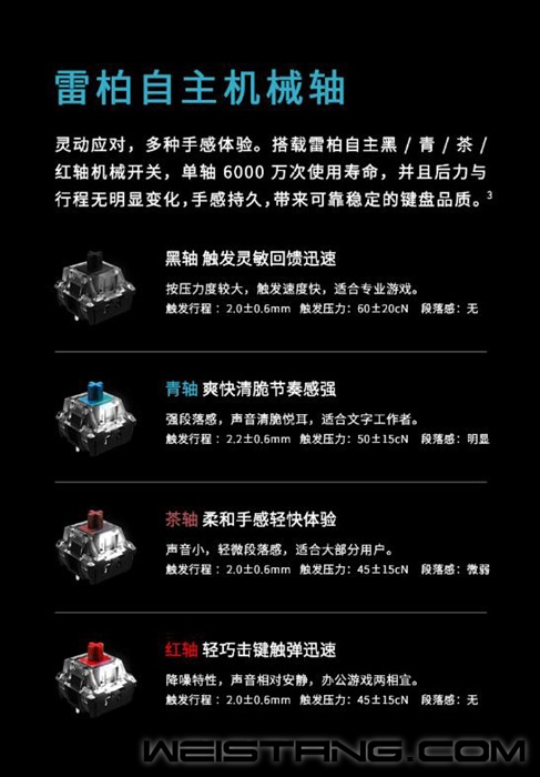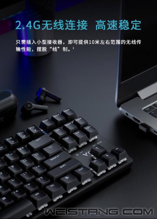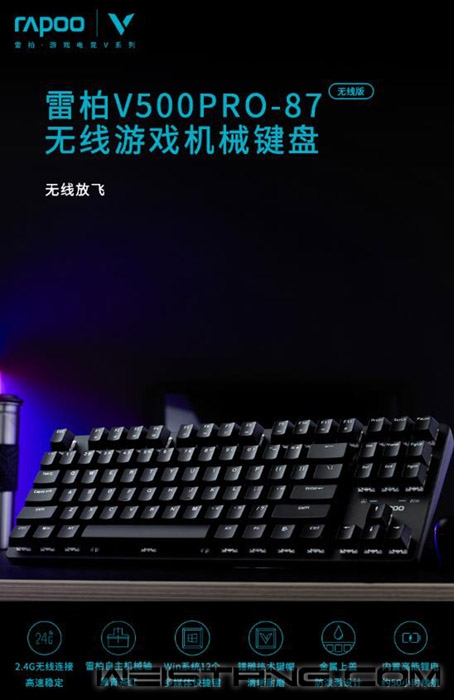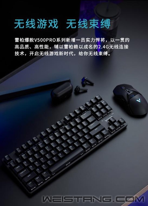 近日,领军国产外设品牌,实力大厂上市企业Rapoo雷柏,推出了V500PRO-87无线版游戏机械键盘,采用雷柏赖以成名的2.4G无线连接技术,拥有媲美有线版的传输体验;雷柏自主黑青茶红游戏轴体,镭雕技术键帽,多媒体快捷键,防溅洒设计,约50小时长续航,为你的电竞主机增添今年机械键盘市场上最惹人注目的产品之一! 雷柏爆款V500PRO系列新增一员实力悍将,用雷柏最引以为傲的2.4G无线连接技术,可提供约10米左右范围传输性能;搭配V500PRO系列的高品质、高性能产品实力,共同为玩家奉上一款可以媲美有线版使用体验的无线游戏机械键盘,无线束缚,开启无线游戏新时代。 内置300mAh高能锂电,配合雷柏的低功耗芯片与节能省电技术,续航时长可达50小时,日常办公可达约15天,免去频繁充电的麻烦。 雷柏自主机械轴,经过几代产品更新,已成为高质量国产轴的代表,黑、青、茶、红四款经典轴体的特色已无需多言,任君所好;6000万次寿命,确保手感持久不变;镭雕技术键帽,字符清晰耐磨,带你体验最原汁原味的机械轴手感。 键帽采用镭雕技术印刻,用料扎实厚道,细颗粒触感,令你一上手便爱不释手。 键盘拥有12个Win系统多媒体快捷键,方便快速切换邮件、浏览器、多媒体播放等操作。 键盘采用金属材质上盖,内置加固金属板,大幅提升机身稳定性,在激烈的游戏中文若泰山,保护键盘轴体和线路板;悬浮式键帽排列,整体视觉更简约大方的同时,也方便清理键帽缝隙中的杂物。 在键盘易用性方面,V500PRO无线版也贴心备至。防溅洒的设计,呵护键盘安全;大面积防滑脚垫,令键盘整体更为稳固,不移位。 |