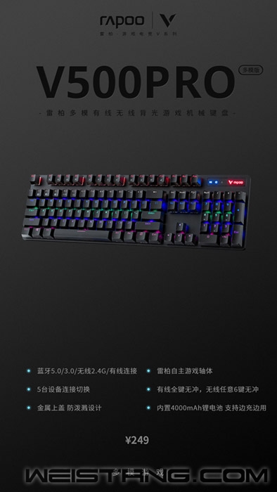 无线束缚的桌面环境能更容易让你在游戏中力拔头筹,无线化的键盘作为其中一个重要的环节,能让玩家拥有更开阔的移动空间,更迅速的连续敲击,实现指哪打哪的精确操作。 近日,领军国产外设品牌,实力大厂上市企业Rapoo雷柏在爆款V500PRO系列持续发力,推出第三款V500PRO系列的无线游戏机械键盘——V500PRO多模版有线无线背光游戏机械键盘。采用蓝牙5.0、蓝牙3.0、无线2.4G和有线四种模式,最多支持5台设备连接切换,雷柏自主黑青茶红游戏轴体,实现有线全键无冲,无线任意6键无冲,内置4000mAh的锂电池,支持边充边使用,为V500PRO无线系列的游戏机械键盘市场再增一枚多模强力之作! 多面能手 游戏狂欢 雷柏爆款V500PRO系列新添一枚实力大奖——V500PRO多模版,蓝牙5.0、蓝牙3.0、无线2.4G和有线四种连接模式技能加持,给予了可同时最多连接5台设备,随心自由快速切换,化繁为简,助你化身多面能手,尽享狂欢游戏盛宴。内置4000mAh大容量锂电,支持边充边用,续航时长可达约1周到1个月,大容量,真能打,开启游戏/办公持久时代。 多重手感 触感细腻 雷柏自主机械轴,经过几代产品更新,已成为高质量国产轴的代表,搭载6000万次单轴点击寿命的雷柏自主黑/青/茶/红轴,四种手感,持久、精确、舒适,三种属性,实战力MAX。镭雕技术键帽,触感细腻,字符清晰耐磨,给你更原汁原味的机械轴手感。 光彩夺目 流光闪耀 雷柏V500PRO多模版的混彩背光系统带来六色彩虹,照亮你指尖上跃动的流光,彩虹之光萦绕于金属之身。6种背光模式任你把玩,彻底激发你的视觉神经。 无冲按键 坚固耐用 键盘采用磨砂金属上盖,104的全尺寸窄边框设计,让键盘的简约线条感十足。悬浮式的人体工学键帽排列,方便清理键帽缝隙中的杂物。在有线模式下,支持全键无冲突,蓝牙和2.4G模式下支持任意6键无冲突同时输入,享受六指琴魔般的畅快游戏。 贴心细节 便捷操作 V500PRO多模版细节之处同样出色。贴心的防溅洒设计,呵护键盘安全;大面积防滑脚垫,令键盘整体更为稳固,不移位。键盘拥有12个Win系统多媒体快捷键,方便快速切换邮件、浏览器、多媒体播放等操作。 雷柏V500PRO多模版无线背光游戏机械键盘作为V500PRO无线系列的又一力作,标志着雷柏游戏V系列持续在无线游戏机械键盘市场的不断壮大,多模的加入让这款机械键盘如虎添翼,一键在手,方便所有。 |