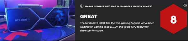 IGN为即将发售的RTX 3080 Ti显卡打出了8分的评分,认为该显卡性价比高,性能卓越,是一款值得购买的游戏显卡。 IGN评分:8分 RTX 3080 Ti是一款不负玩家期待的游戏显卡,这款GPU售价1199美元(约8899人民币),也是一款为性能而生的性价比显卡。 IGN总评: RTX 3080 Ti的诞生让RTX3090显得有些过时,RTX 3080 Ti拥有更小的体积,速度上也毫不逊色,从游戏角度来看,它的性价比也更高。 |