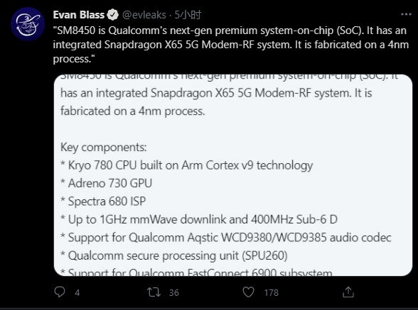 对于高通来说,骁龙888之后的处理器,他们已经在研发当中了,而它是怎样的呢? 现在有关骁龙888升级版的消息开始泄露,从曝光的情况看,高通正在开发一款代号为SM8450 'Waipio的芯片,将作为骁龙 888 (SM8350) 的继任者。 据悉,这款代号为SM8450高通新处理器将基于ARM Cortex v9技术的Kryo 780 CPU内核,GPU为Adreno 730,而ISP是Spectra 680,支持四通道封装LPDDR5 RAM,同时还集成了Snapdragon X65 5G基带。 最后,消息中还提到,骁龙888升级版的性能会大幅提升,其将采用4nm工艺制造。 还应该注意的是,新处理器的DSP从Spectra 580升级到Spectra 680,FastConnect 6900子系统将支持蓝牙LE Audio/5.2和Wi-Fi 6E。 之前还有消息人士透露,骁龙888 Pro可能会在近期被高通推出,从曝光的跑分数据看,这款新品的X1超大核频率从2.84GHz提高到3.0GHz,不过目前还不能确定高通是否为其提升了GPU频率。 跑分数据显示,骁龙888 Pro的单核跑分为1171分,多核跑分为3704分。 |