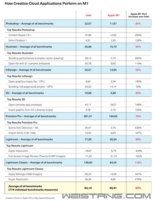 M1的性能表现,已经无需多言,苹果还会继续在自研处理器上发力,这对Intel而言,绝对不是一个好消息。 据外媒最新测试发现,苹果M1 MacBook Pro比类似配置的基于Intel的MacBook Pro平均性能最多提高116%。基准测试涵盖了七个Adobe创意云应用程序,M1 Mac令人信服地击败了基于Intel的MacBook Pro ,测试显示性能平均提升83%。 苹果M1 MacBook Pro拥有16GB的统一内存,加上2TB的PCIe NVMe固态硬盘,与基于Intel的MacBook Pro进行了对比,后者采用酷睿i5处理器,内存和存储数量相同。 简而言之,苹果M1芯片显示了该公司在芯片设计方面的优势,因为它不仅提供了更好的性能,而且电池寿命也远胜于此。就该基准测试而言,它旨在详细分析第一代苹果芯片在创意工作流程中的表现。 Adobe的七个创意云应用程序被纳入基准测试,包括Photoshop、Illustrator、InDesign、Premiere Pro、Lightroom、Lightroom Classic和XD。在774个单项基准测试中,M1 MacBook Pro平均性能比基于Intel的机器高83%,其中Lightroom Classic测试平均性能提高116%,是所有测试中平均领先程度最高的。 |