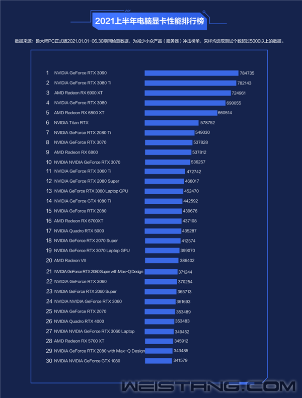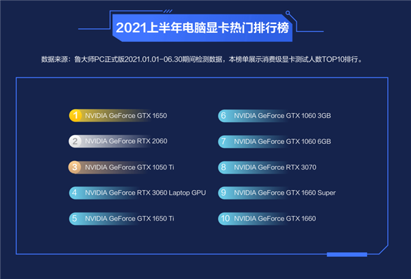 近日,鲁大师公布了2021年上半年的多个电脑、手机排行榜,其中处理器方面AMD、Intel你来我往、局面焦灼,显卡方面则是继续NVIDIA一边倒的架势。 数据来自鲁大师PC正式版2021年1月1日至6月30日期间的检测,只选取测试设备数超过5000的,以避免服务器等小众产品的影响。 TOP30显卡性能榜单上,NVIDIA占据了多达24个席位,最好的自然还是RTX 3090,而新发布的RTX 3080 Ti位列第二,差距并不大,排名第30的则是上上代高端GTX 1080。 除了桌面版的RTX 30/20、GTX 10系列,还有五款笔记本型号上榜,分别是RTX 3080、RTX 3070、RTX 3080 Super Max-Q、RTX 3060、RTX 2080 Max-Q。 AMD方面只有6个位置,最好的是RX 6900 XT排在第三,领先于RTX 3080。由于这代产品更新较慢,Radeon VII、RX 5700 XT依然还在坚守。 TO10P热门显卡全部被NVIDIA拿下,AMD完全不见踪影。 “6”字科依然是玩家们的最爱,居然占了多达8个席位,GTX 1650、RTX 2060最为火爆,RTX 3060移动版、GTX 1650 Ti、GTX 1060 3GB、GTX 1060 6GB、GTX 1660 Super、GTX 1660也都榜上有名。 份额方面,2021年第一季度NVIDIA占据了多达77.54%,虽然环比丢了0.38个百分点,但同比暴涨9.08个百分点。 AMD的高光时刻则是去年第四季度,一度超过30%。 |