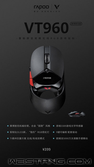 雷柏VT960赛博朋克版屏显双模无线RGB游戏鼠标正在加载……….. 侵入人体的改造、机械融合、神经网重塑在融合的血液中等待启动;压抑的水泥丛林没有法则定律,献身科技隐匿行踪是生存唯一前提。水泥构筑的森林、浑浊空气、压抑的情绪在霓虹的闪烁中撕裂而出。 RAPOO // MECHANICAL NEUROLOGY ADAPTING TI TEXAS WIRELESS SOLUTION READY (1) GAMING MODE LOADING (2) // CYBERPUNK VT960 GAMING MOUSE ACTIVITED…. 视频链接:https://www.bilibili.com/video/BV1D44y1275Q //阶段一 神经机械嵌入高能金属,接入量子网络 RAPOO制造重型切割铝合金,镂空环绕一体成型,装配赛博朋克超跑硬朗外壳,复杂神经网络嵌入硬朗金属外壳,超跑流线设计搭配肉眼可辨的“中枢神经”挑战视觉极限。生物大脑级褶皱厚度刻录中枢神经网络,机械构造取代身体一部分。神经网络设计激活硬核机体,100%灵智挖掘,开拓蛮荒世界,展现高速运算储备,同时增加表面摩擦,搭配5000万次欧姆龙微动,带来清爽、精准手部操作传达。 //阶段二 科技芯片替换生物大脑,进入亿级计算 无序的混乱都市,透过雾霾的霓虹是生存之道致幻的警告,极致的速度是避免标记的永恒准则,清晰的意识传达是生存选择的不变定律。Ti德州仪器无线方案,解锁最快1毫秒延迟响应速度,原相3389游戏传感器展现电竞级性能,配合800-16000 7档DPI循环调节,分毫级位移精准捕捉,操作意识实时反馈。9个可编程按键配合火力/狙击键,驱动赛级全能配备,简化操作把握瞬息战机。 //阶段三 镂空机体加入绚烂霓虹,开启赛博时代 灯火阑珊的水泥夜色,千万色霓虹伪装机身,金属环形带包裹循环灯效藏匿踪迹,客制化OLED显示器实时掌握战斗状态。VT960赛博朋克版RGB幻彩灯效,1680万色灯光标识,5种灯光模式预设同时可自定义颜色。霓虹之下皆为一般众生相,自定义色彩摒弃同质化,幻彩RGB释放独特个性,挑战赛博朋克都市法则。 雷柏VT960赛博朋克版屏显双模无线RGB游戏鼠标 一片无法逃离霓虹的水泥性都市,一台隐匿在黑暗之中的镂空跑车,一项侵入式的神经机械改造计划 // VT960 CYBERPUNK EDITION READY FOR REACTIVITING… |