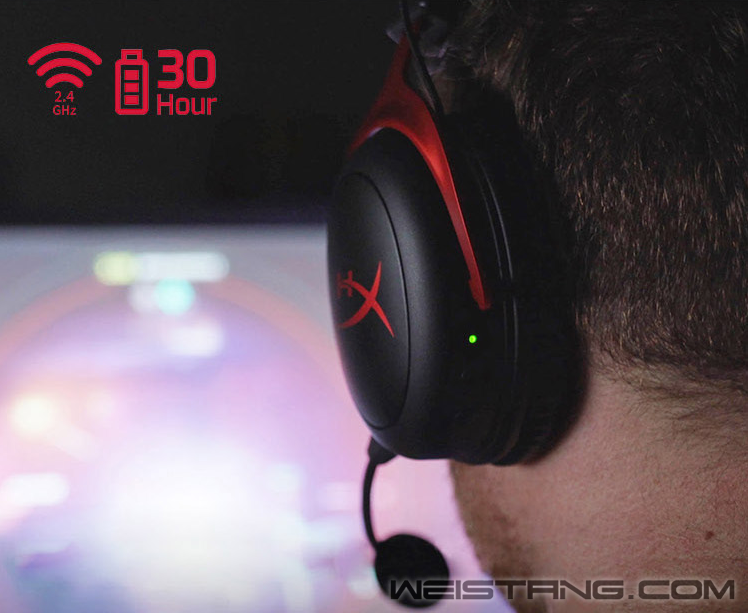 有玩家担心大耳机会不会难驱动?虽然HyperX飓风无线游戏耳机的驱动单元达到了53mm,但是其阻抗只有60Ω,各种数码装备可轻松推动。通常,阻抗越高,耳机灵敏度也越高,反之亦然,所以高保真耳机的阻抗通常都是在64Ω以下,无需外接耳放既可呈现高品质声音。 低延迟 即插即用的2.4GHz无线连接 与其他需求不同,玩家们使用游戏耳机对延迟的容忍几乎为零。听音乐,哪怕延迟1秒都无所谓;看大片,延迟0.5秒以上的观看体验就已经不理想,声画不同步会大大影响观看体验;而游戏则对延迟零容忍,电光石火间结束的枪战,之后才传来阵阵枪声,与敌人撞了一个满怀才传来敌人的脚步声,这些尴尬是玩家无法接受的。 现如今,最为成熟的无线连接方式大体分两类,2.4GHz和蓝牙连接。前者采用USB接收器,即插即用,抗干扰、低延迟、传输距离远;后者需要复杂配对,并且延迟是硬伤,对于FPS类游戏来说并不是最适合的。 环绕立体声 影音盛宴的定海神针 不管游戏或者影音,环绕立体声可以带给玩家十足的临场感,堪称影音盛宴的定海神针。HyperX飓风无线版游戏耳机就提供了虚拟7.1环绕立体声支持,无论是在游戏之余聆听美妙的音乐,还是观看刺激震撼的大片,身临其境的沉浸感都让人回味无穷。当然,部分游戏并不支持环绕立体声,也可以通过HyperX NGENUITY驱动软件关闭虚拟7.1环绕立体声,待需要时还可重新开启。