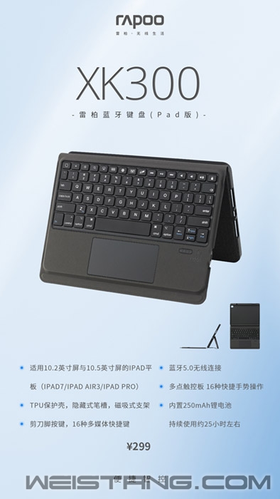 苹果的iPad系列这些年作为平板市场上的用户首选,官方的iPad键盘动辄上千的售价,一直高高在上不接地气。近日,领军国产外设品牌,实力大厂上市企业Rapoo雷柏推出了XK300蓝牙键盘(Pad版),为10.2英寸屏与10.5英寸屏的iPad系列量身打造,适用IPAD7/IPAD Air 3/IAPD PRO,采用蓝牙5.0连接,配备TPU保护壳,隐藏式笔架以及磁吸式支架,多点触控板,支持16种快捷手势操作,内置锂电续航25小时左右,让你的iPad如虎添翼。 XK300采用真机开模,大小尺寸与10.2英寸屏与10.5英寸屏的iPad平板(iPad7/Air 3/PRO)完美贴合,键盘上部设有专用卡槽,键盘/保护套二合一。此外,在键盘的背部还有一个隐藏式的笔槽设计,方便随身携带触控笔,防止掉落。键盘上设有磁吸式支架,基于人体工学,让你手中的iPad变身笔记本,享受专业娱乐办公快感。 XK300采用蓝牙5.0技术,传输效率更高、能耗更低,大大提升产品的续航能力。在连接方面,可覆盖约10米传输范围,无论你是在客厅、餐厅,还是在人多的公共场所,XK300都能确保信号传输稳定可靠,让操作不断线。 作为平板专用键盘,触控板自然不会少。XK300配备高精度多点触控板,拥有宽敞触控区域,让操作更加放松从容。同时,XK300还支持多达16种手势操作,全新的交互方式,带你畅游iPadOS,精彩触手可及。 常用的多媒体快捷键印刻在键盘的第一排功能区,通过按下第一排的功能键,可快速切换锁屏、屏幕键盘、多媒体等功能,高效办公、畅快娱乐。同时,键盘采用雷柏刀锋系列经典的剪刀脚结构,辅以精选硅胶颗粒,键帽受力更均匀、回弹更迅速,长时间输入亦如行云流水般舒畅。 键盘采用TPU的面质材料,柔软的硅胶保护套,防滑防刮,防摔防撞,透气耐脏,给iPad更好的保护。保护套底部的蜂窝设计,能为iPad提供更好的散热,让iPad能有更持久的寿命。 在电池续航方面,XK300内置250mAh高能锂电,充满电可支持约25小时持续使用, 待机可达100天。自带USB-C充电线,约2小时即可充满电,享受科技带来的便利。 iPad7/Air 3/PRO专属,键盘/保护套二合一,多点触控板、16种手势操作,蓝牙5.0无线传输,TPU保护壳,磁吸式支架,多媒体快捷键…雷柏XK300蓝牙键盘(Pad版)无疑是iPad7/Air 3/PRO的首选搭档,现上市诚意价仅299元,感兴趣的朋友千万不要错过。 |