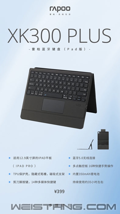 近日,领军国产外设品牌,实力大厂上市企业Rapoo雷柏新近推出一款专属iPad Pro的蓝牙键盘——XK300 PLUS(Pad版)。为12.9英寸屏的iPad Pro系列量身打造,采用蓝牙5.0连接,配备TPU保护壳,隐藏式笔槽以及磁吸式支架,多点触控板,支持16种快捷手势以及14种多媒体快捷键操作,内置锂电续航35小时左右,让手中iPad Pro摇身变为笔记本,享受专业娱乐办公快感。 雷柏XK300 PLUS采用蓝牙5.0高速连接方式,能够有效的保证稳定,安全,高效。为了便携办公,XK300 PLUS背部隐藏式的笔槽设计,方便随身携带触控笔,防止触控笔丢失或摔落,为办公贴身准备。 XK300 PLUS的触控板能提升iPad Pro的办公操控效率,宽敞的触控区域,支持4指操作和多种触控手势。为了满足用户办公的功能性,XK300 PLUS采用了多功能独立按键,满足多样化的需求。14种多媒体按键,可快速切换锁屏、屏幕键盘、多媒体等功能,高效办公,畅快娱乐,更好畅游IPAD-OS。 既然是能将iPad Pro变身笔记本,那实体键盘的触感肯定是少不了,雷柏XK300 PLUS传承雷柏刀锋系列的剪刀脚结构,辅以精准硅胶颗粒,令键帽受力均匀、回弹迅速、按键触感磨砂,打字手感舒适。 从外表材质来说,TPU皮质面料是最适合不过,透气耐脏,防刮防滑,方便安全拿在手里,不怕不小心滑掉。保护套内部采用柔软硅胶,防摔防撞,简单拆装不伤机,给予iPad Pro更好的保护,底部蜂窝设计,能够使iPad Pro得到更好的散热。 内置电池续航时间一直是现代人最重视的数据了,XK300 PLUS内置350mAh高能锂电,充满电可支持约35小时持续使用,待机时间可达100天。打开唤醒,合上休眠,智能省电。自带USB-C充电线,约3-4小时充满电,享受科技带来的便利。 雷柏XK300 PLUS蓝牙键盘(Pad版)官方售价399,键盘/保护套二合一,多点触控板、16种手势操作,蓝牙5.0无线传输,TPU保护壳,磁吸式支架,多媒体快捷键…既然拥有了iPad Pro,配置当然要到位,有iPad Pro 12.9英寸的朋友可以留意一下哦! |