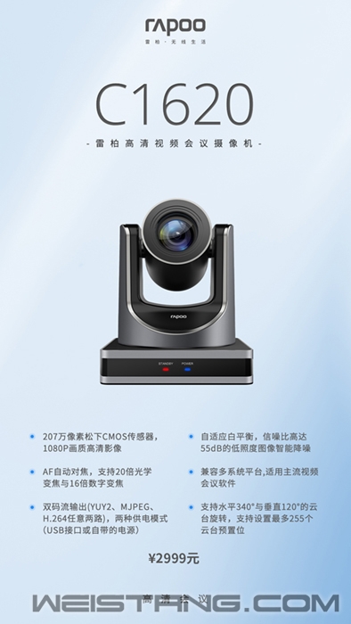 因为疫情的原因,需要经常谈合作,开会的人士出差频率也随之下降,而更多采用视频会议的方式去沟通确认相关事项。一个能实现AF自动高清对焦,多云台预置位,多倍变焦的视频会议摄像机则能让整个视频会议得到更好的呈现,人与人之间得到更好更顺畅的沟通。 近日,领军国产外设品牌,实力大厂上市企业Rapoo雷柏推出了首款高清会议视频摄像机——C1620,207万像素松下CMOS传感器,1080P画质高清影像,AF自动对焦,支持20倍光学变焦/16倍数字变焦,自适应白平衡,双码流输出,提供两种供电模式,高达55DB信噪比的低照度智能降噪,支持水平340°垂直120°的云台旋转,并且支持设置最多255个的云台预置位等诸多功能集一身的会议摄像机,即刻开启流畅高清的视频会议。 C1620采用松下1/2.8英寸高品质HD CMOS传感器,搭配207万的有效像素以及1080P的AF 自动对焦镜头,能快速获取高清画面,此外支持20倍的光学变焦,16倍的数字变焦,无论是远景还是近景,都能清晰的捕捉画面,全程有效保证流畅高清的视频会议,沟通交流更顺畅。此外摄像机带有可拆卸的保护盖,可根据使用的环境自由拆装,有效保护镜头避免受损。 C1620支持水平340°与垂直120°的云台旋转,并且能以高速度,低噪音进行平移以及俯仰旋转操作,快速定位在相关的位置,进行大范围的拍摄。此外支持最多255个云台预置位,遥控器还可设置10个预置位,一键快速调用预置位,指哪拍哪。满足不同的会议需求。 光照对于视频会议的影响也是不可避免的,有时候因为强光与弱光的频繁切换导致不佳的视频会议效果,从而影响整个会议的进度。C1620拥有自适应的白平衡功能,辅以智能的降噪技术,同时应用2D和3D的降噪算法以及高达55DB以上的信噪比,能有效降低图像噪点,还以一个清晰会议。 C1620兼容Windows,Mac OS等主流的电脑系统,全功能USB接口的加入,兼容USB3.0、USB2.0,支持音频以及编码输出,UVC 1.1~1.5的视频通信协议,能更好的适配各大视频会议软件以及网络视音频软件。RS232接口的加入,可对摄像机进行远程控制。同事支持双码流输出(YUN2、MJPEG、H.264任意两路),减轻主机编码压力。此外还支持USB 5V以及电源适配器12V两种供电,满足不同的使用环境。强大的性能以及兼容适配能力能让摄像机广泛适用于远程会议、远程教育、远程医疗等场景。 C1620可以根据不同的会议需求提供多种安装方式,支持吊顶,壁装,三脚架、桌面等个性化设计需求,满足不同的会议安装需求。此外通过遥控器的快捷键可设置图像翻转,特别适用于吊顶安装的会议场景,只需一键可快速实现图像翻转。 C1620高清视频会议摄像机作为雷柏首款摄像机的重磅产品,207万像素松下CMOS传感器,AF自动对焦的1080P高清影像,支持20倍/16倍 光学/数字变焦,自适应白平衡,高达55DB的信噪比,支持水平340°垂直120°的云台旋转,并且支持设置最多255个的云台预置位,兼容多系统以及多种网络办公会议软件。官方指导价为2999元,产品现已上市。 |
