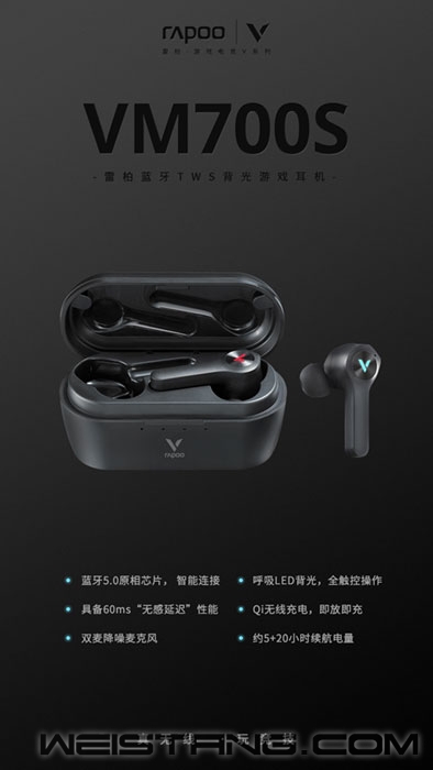 披荆斩棘,生来为赢,一直向前,从不停留。 欢迎进入TWS游戏领域, 准备好你的多巴胺了没? 雷柏VM700S蓝牙背光游戏耳机, 让听觉、视觉进入“合一”状态。 无感延迟,还带无线充! 切换“PixArt游戏模式”精进勇猛, 正面刚敌横扫碾压过关斩将。 原相PAU1606高性能蓝牙连接方案, 稳定信号、低延迟、低功耗,灵性走位, 小于60ms的“无感延迟”连接, 弹无虚发,精准狙敌! 钕磁材料扬声器诠释赛场之魂, 还原声音细节,提升游戏沉浸感, CVC降噪麦克风,有效抑制反向噪音, 让沟通更有效。 真正的型,是骨子里都闪着光, 视线所及之处,皆可引燃肾上腺素, 冰霜蓝、竞速红竞技灯光, 兼顾耳机状态指示灯功能, 带着睥睨的气场一路开黑! 无实体按键触控,实现多媒体、通话等操作, 耳机约5h+充电盒约20h续航, 支持Qi无线充电,即放即充, 锐不可当,强势收割,合力拿下每一圈。 点开视频,听声辨位,狂暴输出,一举灭队。 视频链接:https://www.bilibili.com/video/BV1ff4y1573q 原相PAU1606高性能蓝牙连接方案,信号稳定、延迟低、功耗低,覆盖约10米左右传输范围。VM700S拥有“凌波微步”般的迅捷,通过高压缩率、宽频解码等技术,小于60ms的“无感延迟”连接性能成为耳机的另一利器,听声辨位帮助特种兵实现一击制敌的梦想,制霸战场!记得切换“PixArt游戏模式”,实现更多、更丰富的战斗乐趣。 颜色是直抵神经的第一个信号,代表自由能量的冰霜蓝,代表冒险战甲的竞速红,将竞技色彩风格发挥淋漓尽致,同时兼顾耳机状态指示灯功能,只一眼,就让人移不开眼。VM700S无实体按键实现从容触控,实现多媒体、通话、唤醒语音助手等操作,增加几分激情与热血,如果你敢于冒险,它将是陪你前行的红色战甲。 召唤出武器库---Qi无线充电功能,将充电盒放置于支持Qi协议的无线充电座/鼠标垫,即放即充,为你找到无线竞技的理由。VM700S耳机支持约5h使用,充电盒额外提供约20h续航,威猛AKM强势出击。 VM700S的钕磁材料扬声器,带来更加清透自然的听感,三频更均衡,声音还原更真实准确,舒适感、安心感、沉浸感、自在感,轻松掌握决赛圈技巧。VM700S两个耳机均设有麦克风,并拥有CVC降噪技术,智能识别所处环境,有效抑制反向噪音,开黑语音沟通更顺畅,等待最佳进攻时机。 |