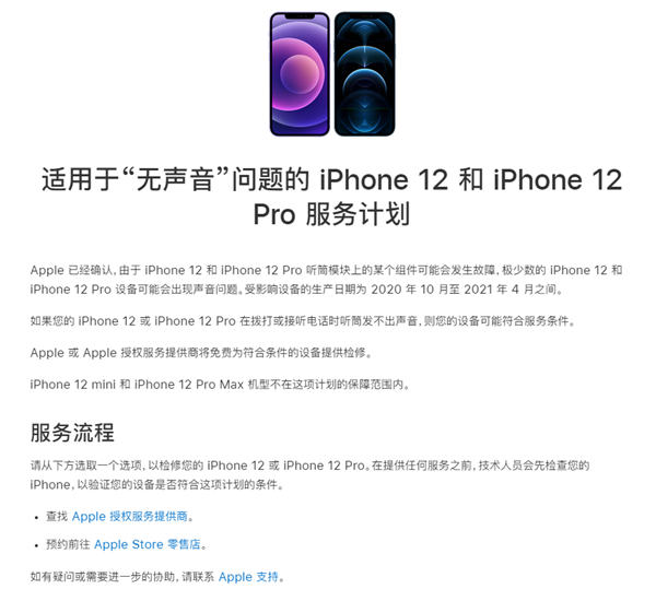 苹果最新宣布了一项新的服务计划,针对在拨打或接听电话时出现声音问题的iPhone 12和iPhone 12 Pro机型。 按照苹果官方公布的细节,有问题的机型涵盖了,2020年10月至2021年4月期间生产的iPhone 12和iPhone 12 Pro的设备。 苹果方面表示,由于接收器模块上的一个组件可能出现故障,"非常小比例"的iPhone 12和12 Pro型号可能会出现声音问题。受影响的设备在拨打或接听电话时不会从接收器发出声音。 很显然,上述问题是针对全球用户,而苹果中国官方也是第一时间回应称,如果中招的用户可以去苹果及其授权服务商将免费为符合条件的设备提供检修服务。 受影响的人可以带着他们的iPhone 12或12 Pro设备到苹果公司或苹果授权的服务提供商那里接受免费服务。像往常一样,设备将在服务前接受检查,客户可能需要支付妨碍完成音频修复的维修费用。 该计划涵盖受影响的iPhone 12和iPhone 12 Pro设备,在首次零售后两年内。 苹果指出,其他iPhone型号包括iPhone 12 mini和iPhone 12 Pro Max不在该计划范围内。 |